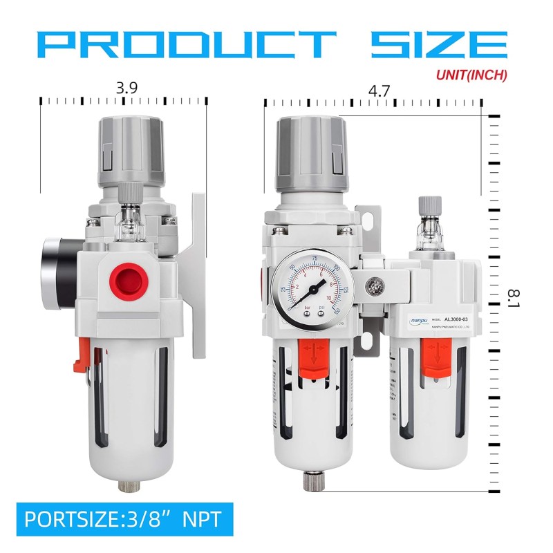 Be the first to review “3/8″ NPT Compressed Air Filter Regulator Lubricator Combo Water/Oil Trap Separator – Gauge(0-150 psi), Poly Bowl, Semi-Auto Drain, Bracket – 3 in 1 Two Unit” Cancel reply