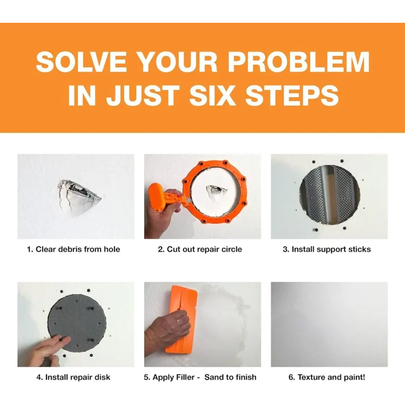 Complete wall repair kit with everything you need to fix a dry wall hole 6.75 inches in diameter or less. No need for additional tools or supplies and anyone can do it with a super professional grade repair.