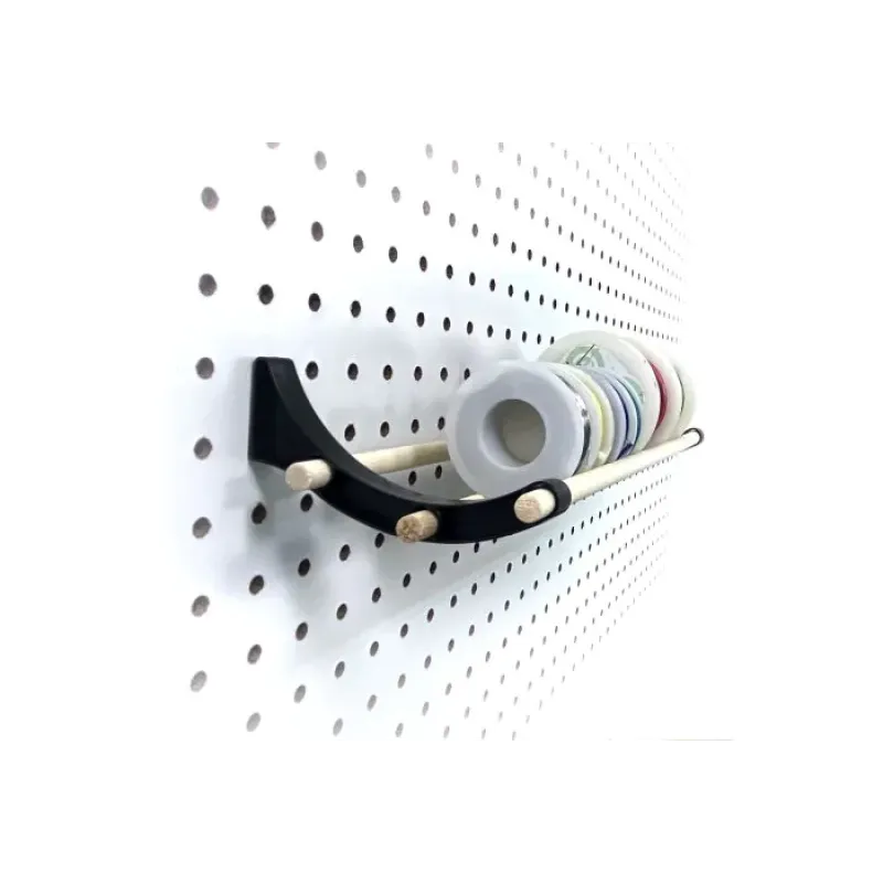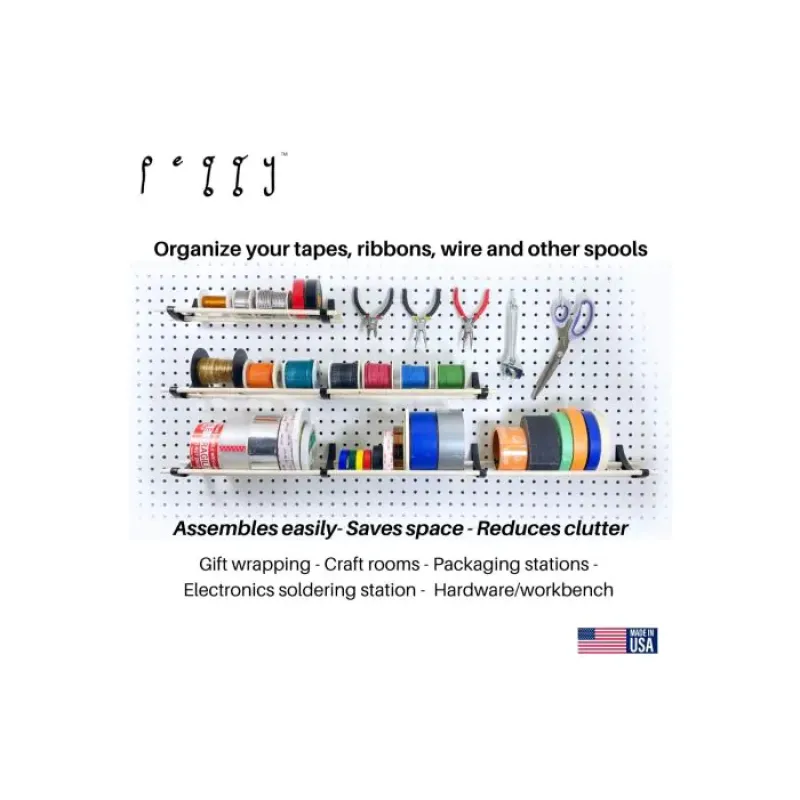 Introducing the Peggy Pegboard Organizer Kit: your ultimate solution for organized and efficient storage! Designed with crafters, DIY enthusiasts, and professionals in mind, this kit utilizes a smart hook and dowel system, featuring three sturdy 3/8” dowel rods inserted into semi-circular pegboard hooks. This innovative system transforms any space into a tidy haven for tapes, ribbons, wire spools, solder, and other cylindrical tools essential for crafts, gift wrapping, electronics repairs, and beyond.