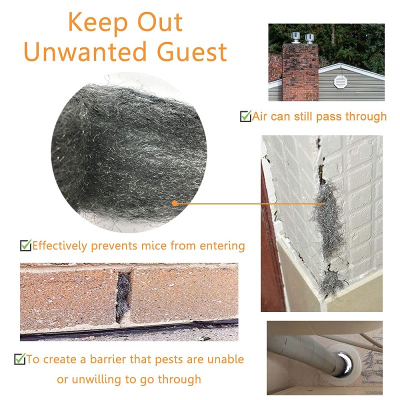 - Widely Use: Steel wool can be used for indoor and outdoor filling. Such as holes or crevices in brick walls, around plumbing pipes air conditioning units, windows, vents, siding, garage, kitchen, attic and more. Effectively deter rodents, insects and other pests from entering homes or office buildings.